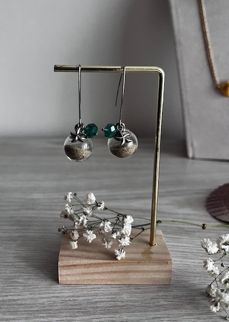 Élégantes et intemporelles, ces boucles d’oreilles pendantes accessoirisées par une Bulle en verre remplie de sable, véritable, sont soigneusement montées à la main. Leur design minimaliste et raffiné en fait un accessoire parfait pour toutes les occasions, du quotidien aux événements les plus chics.
