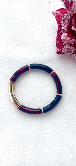 Bracelet perle tube en acrylique sur fil élastique, décliné en plusieurs combinaisons de couleurs. Léger, moderne et confortable. Longueur approximative: 17.50 cm.