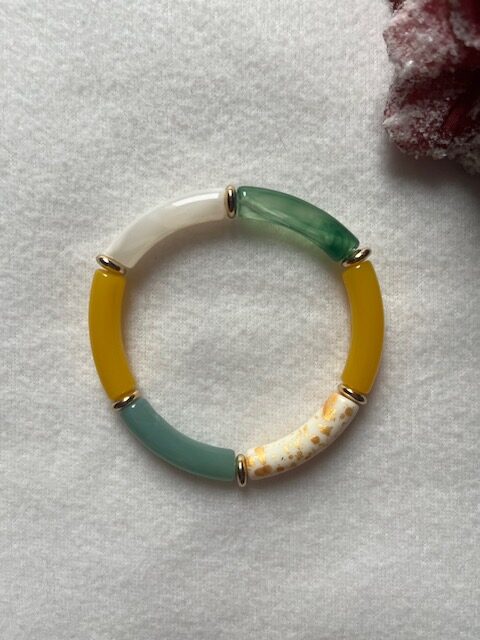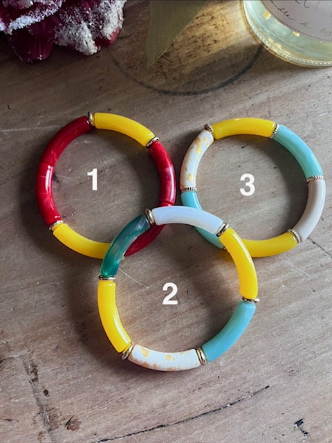 Bracelet perle tube en acrylique sur fil élastique, décliné en plusieurs combinaisons de couleurs. Léger, moderne et confortable. Longueur approximative: 17.50 cm.
