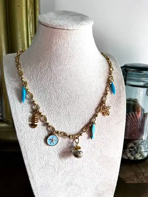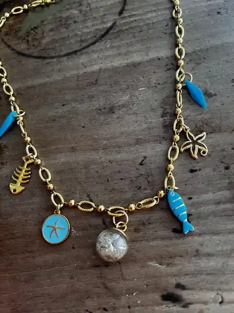 Ce collier* accessoirisé de ses 7 breloques dorées à l’or fin, dans une colorimétrie bleu et de sa bulle de sable** de nos côtes Charentaises, est pensé comme une véritable bulle de protection à porter chaque jour.