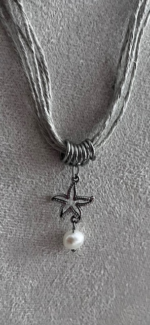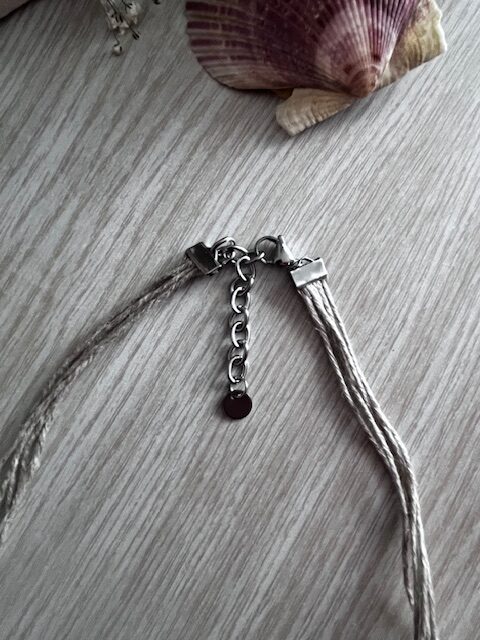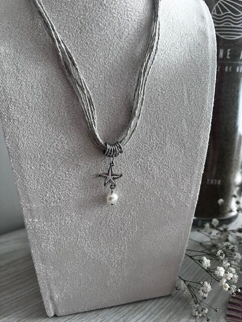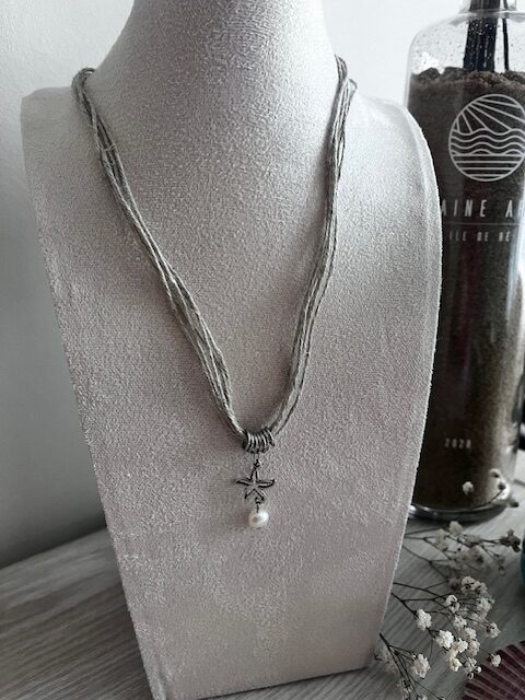 Composé de plusieurs cordons en lin aux teintes douces et naturelles, il est sublimé par une étoile de mer en acier inoxydable, symbole marin intemporel, accompagnée d’une perle d’eau douce qui apporte une touche de finesse et de féminité.
