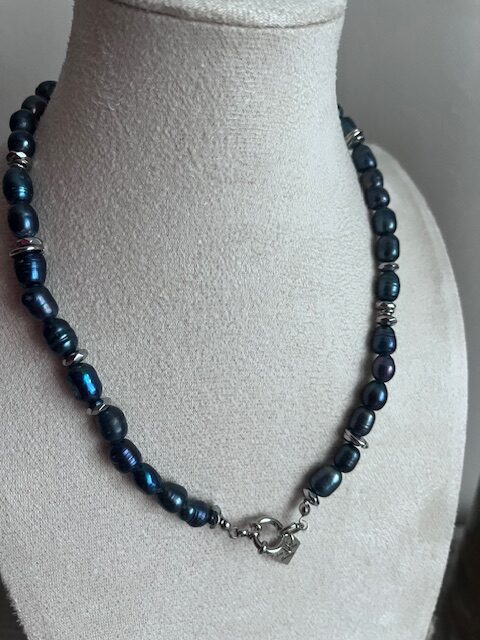 Composé de perles aux reflets bleu nuit irisés, il est ponctué de finitions en acier inoxydable qui apportent lumière et contraste. Son fermoir en forme de bouée, à la fois pratique et décoratif, devient un véritable élément de style porté à l’avant ou à l’arrière du cou.