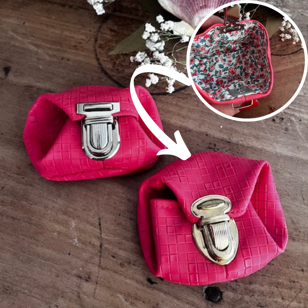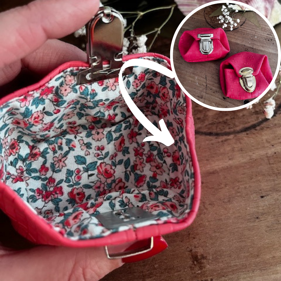 Entièrement cousu main et doublé pour plus de solidité, il est disponible en différentes variations : similicuir brillant ou tissu fantaisie, selon vos envies. Son format compact (environ 7 à 8 cm) en fait l’allié idéal pour ranger votre monnaie, vos bijoux ou vos petits accessoires du quotidien.
